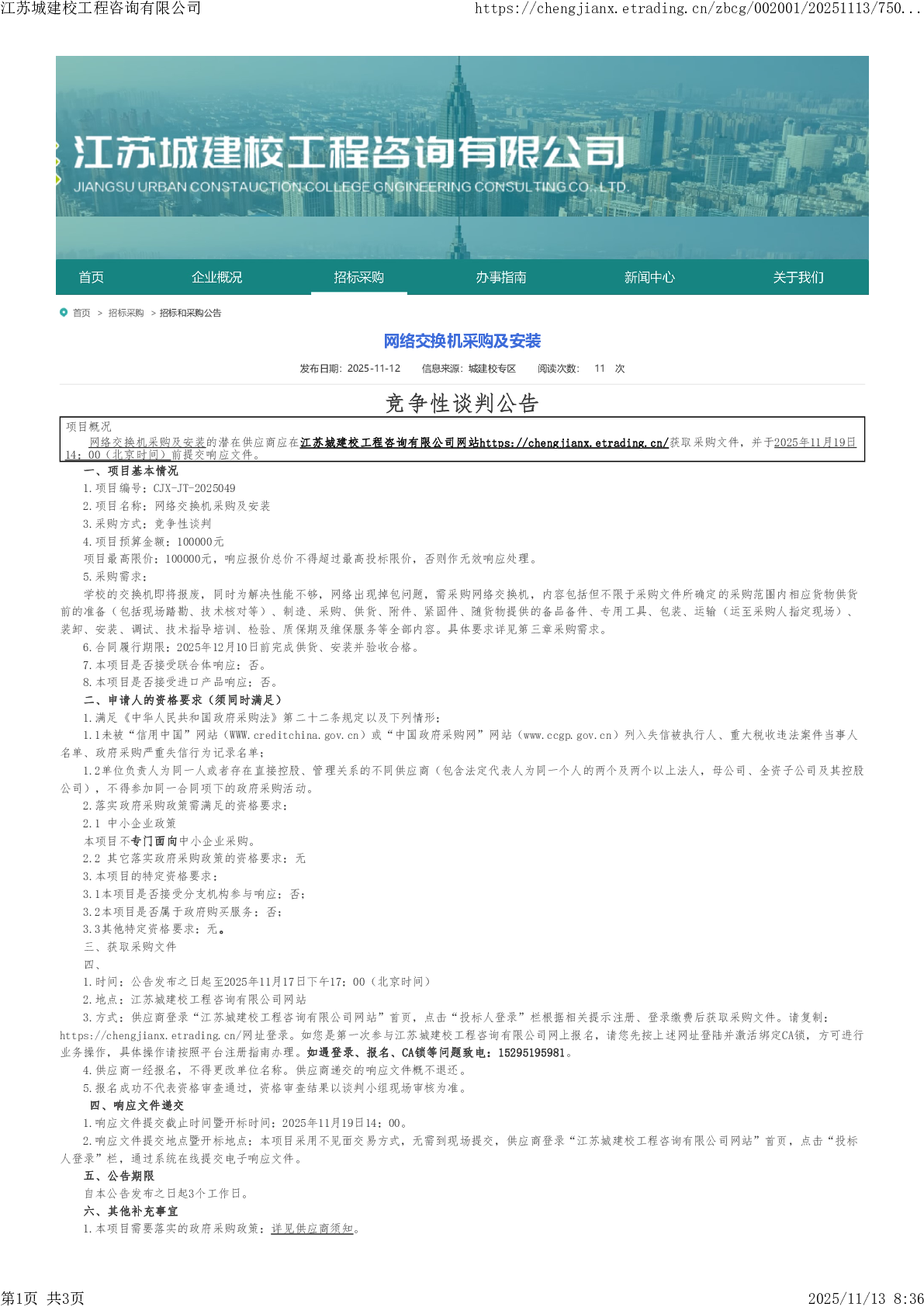 江苏城乡建设职业学院网络交换机采购及安装竞争性谈判采购公告