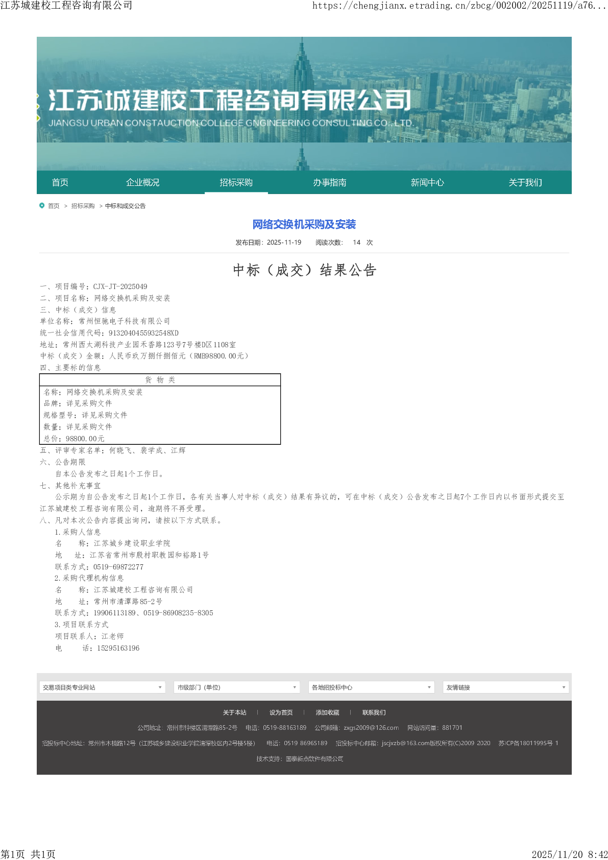江苏城乡建设职业学院网络交换机采购及安装成交公告