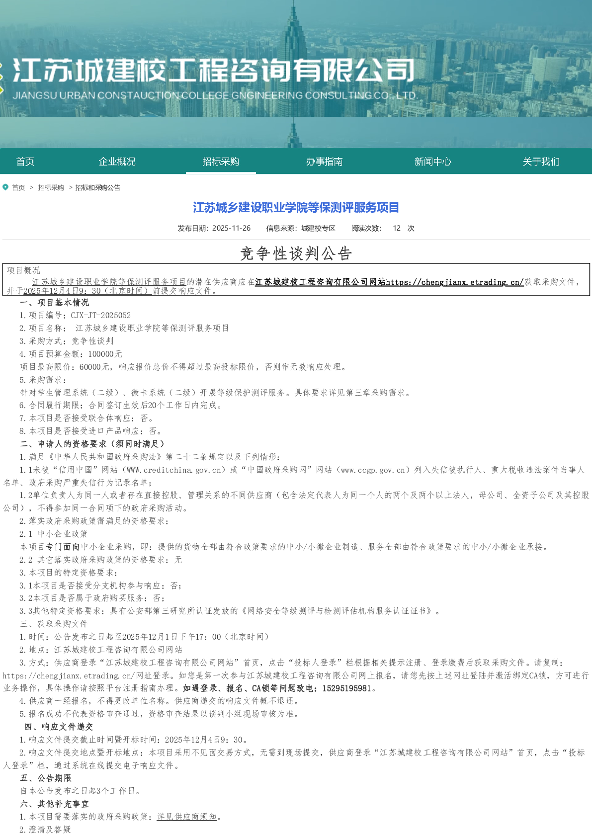 江苏城乡建设职业学院等保测评服务项目竞争性谈判采购公告