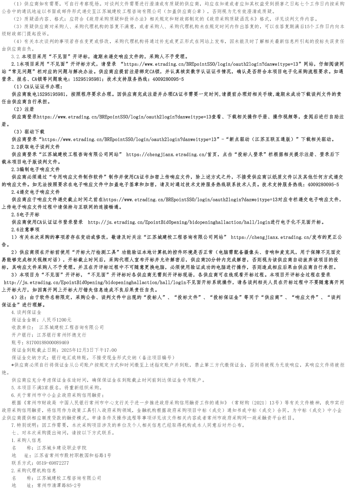 江苏城乡建设职业学院一般实训设备采购竞争性谈判采购公告