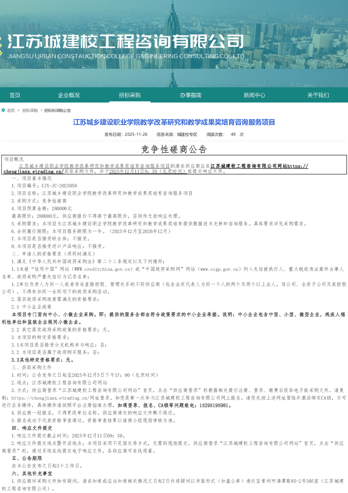 江苏城乡建设职业学院教学改革研究和教学成果奖培育咨询服务项目竞争性磋商采购公告