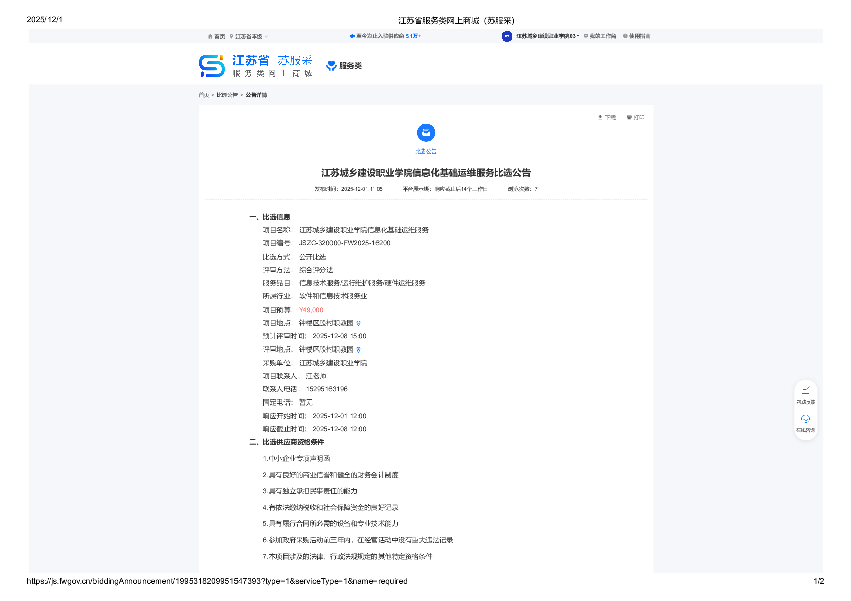 江苏城乡建设职业学院信息化基础运维服务比选公告