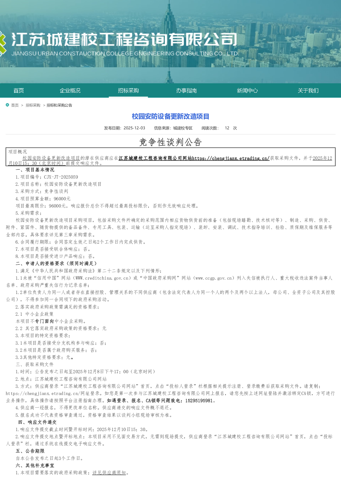 江苏城乡建设职业学院校园安防设备更新改造项目竞争性谈判公告