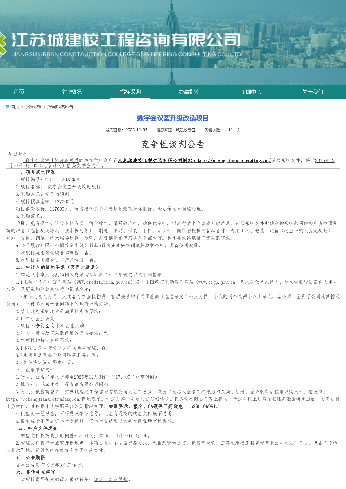 江苏城乡建设职业学院校园数字会议室升级改造项目竞争性谈判公告