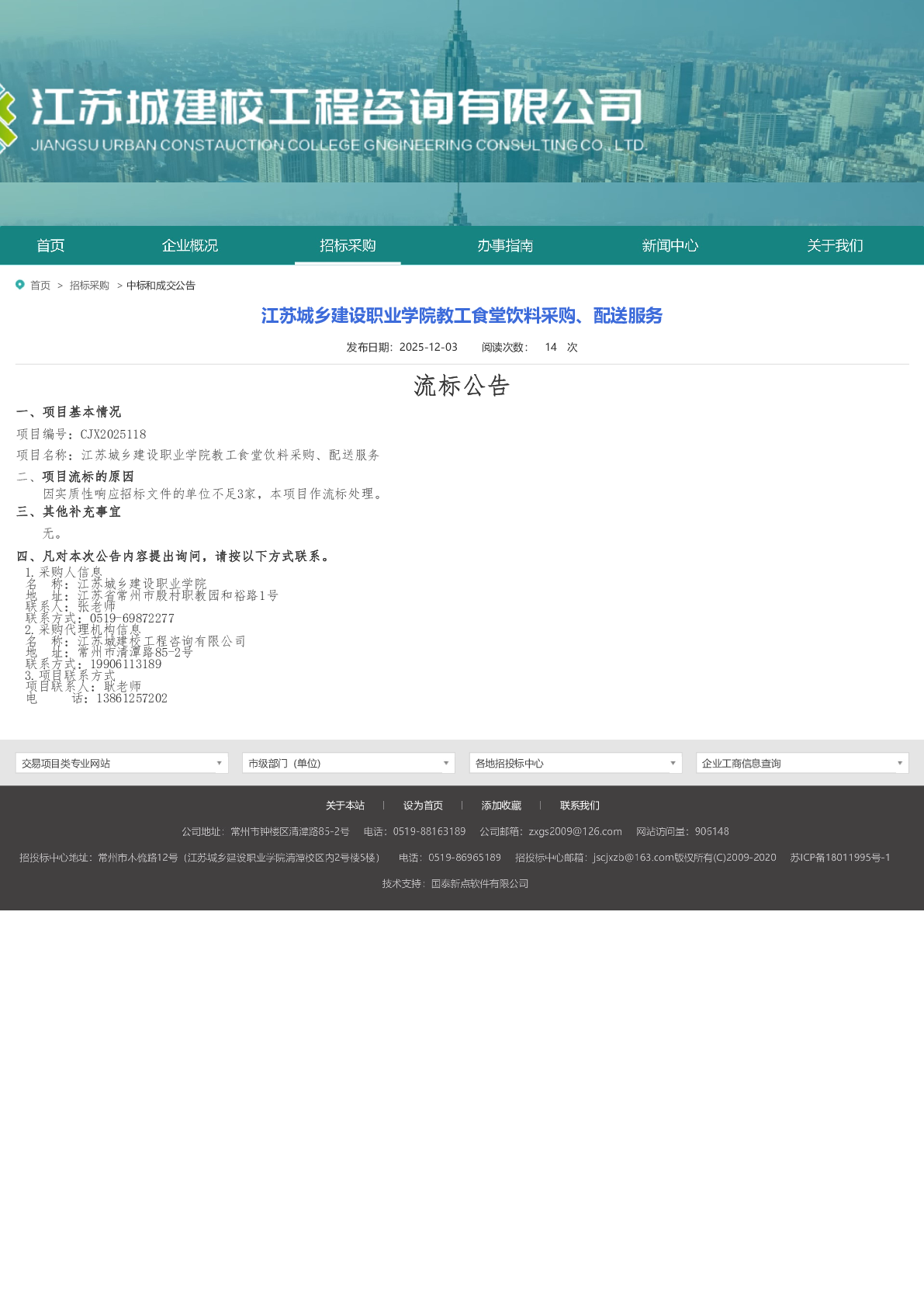 江苏城乡建设职业学院教工食堂饮料采购、配送服务流标公告