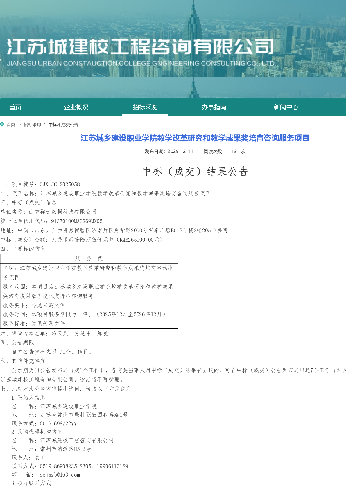 江苏城乡建设职业学院教学改革研究和教学成果奖培育咨询服务项目成交公告