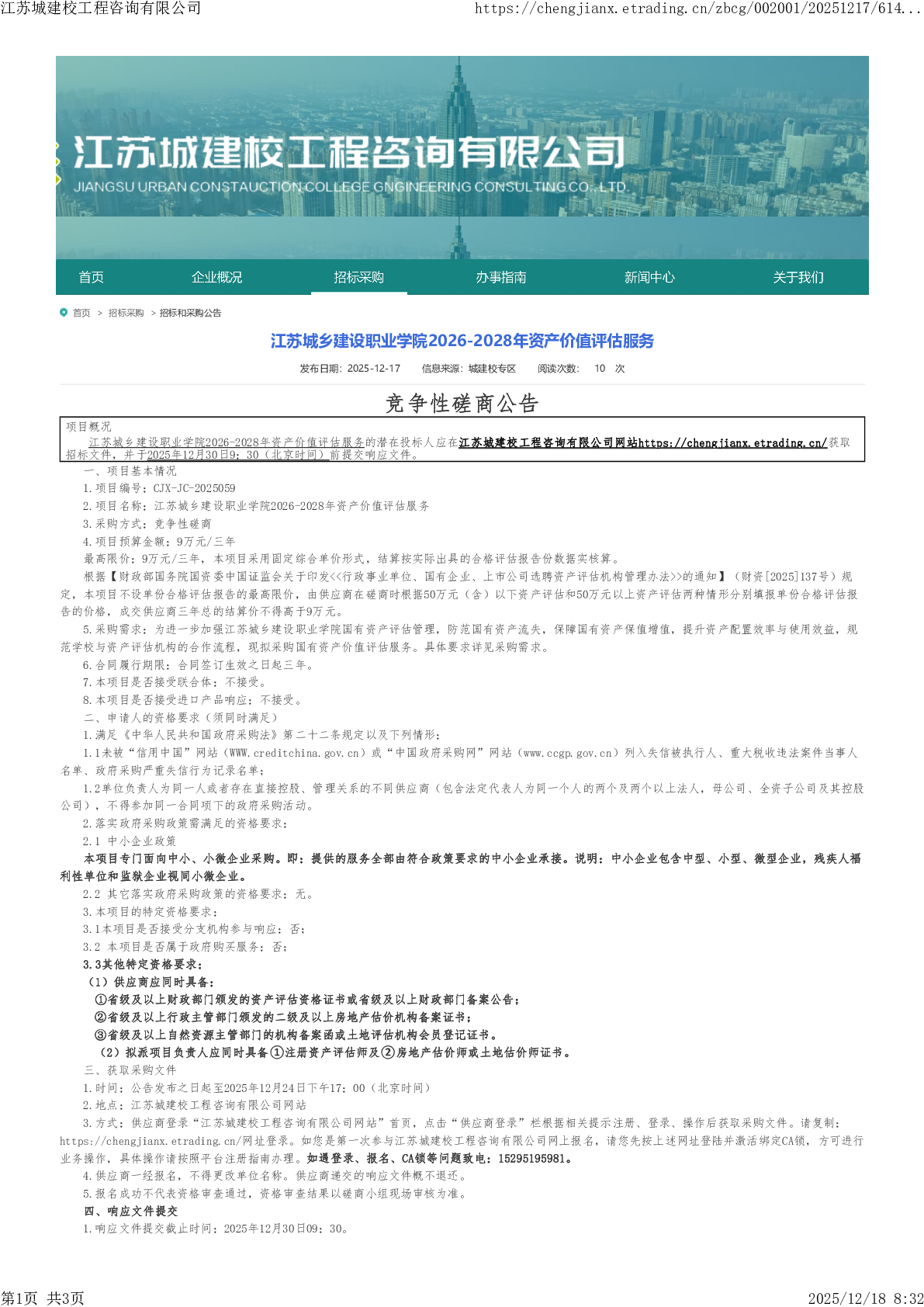 江苏城乡建设职业学院2026-2028年资产价值评估服务竞争性磋商公告