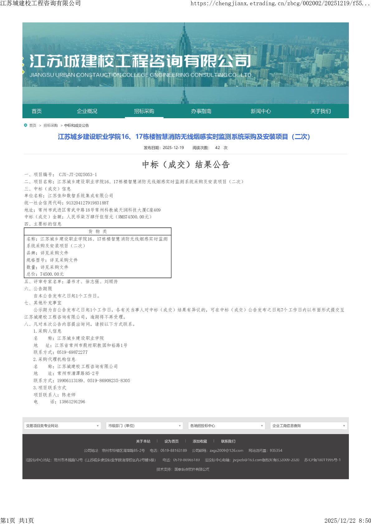 江苏城乡建设职业学院16、17栋楼智慧消防无线烟感实时监测系统采购及安装项目(二次) 成交公告