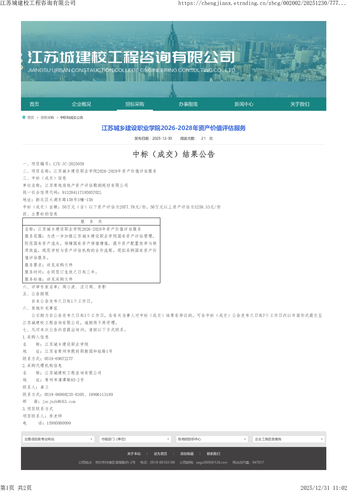 江苏城乡建设职业学院2026-2028年资产价值评估服务成交公告