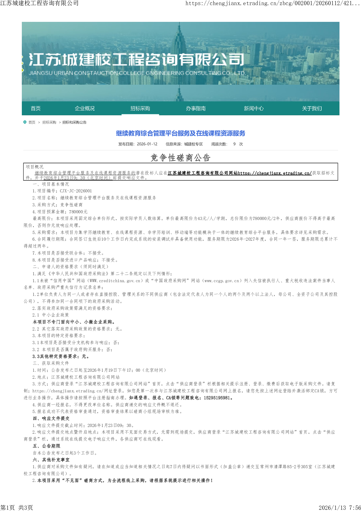 江苏城乡建设职业学院继续教育综合管理平台服务及在线课程资源服务采购公告