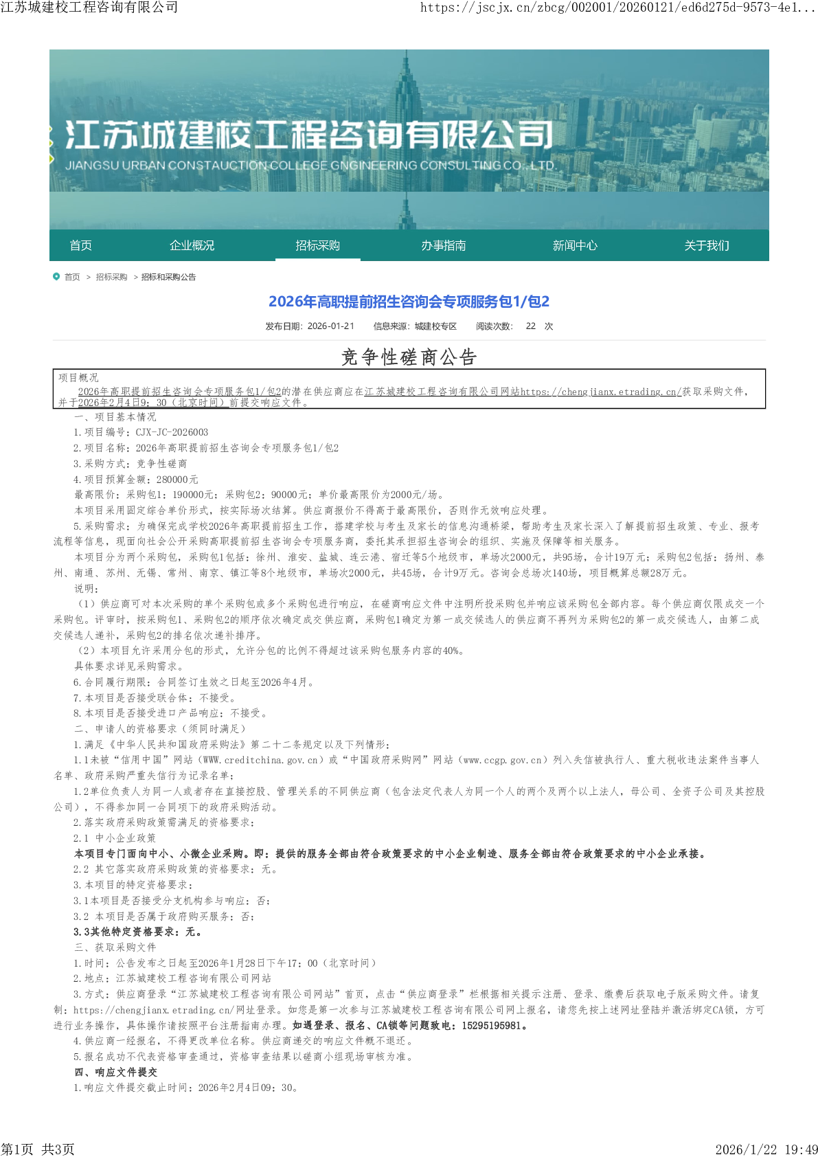 江苏城乡建设职业学院2026年高职提前招生咨询会专项服务包1/包2采购公告