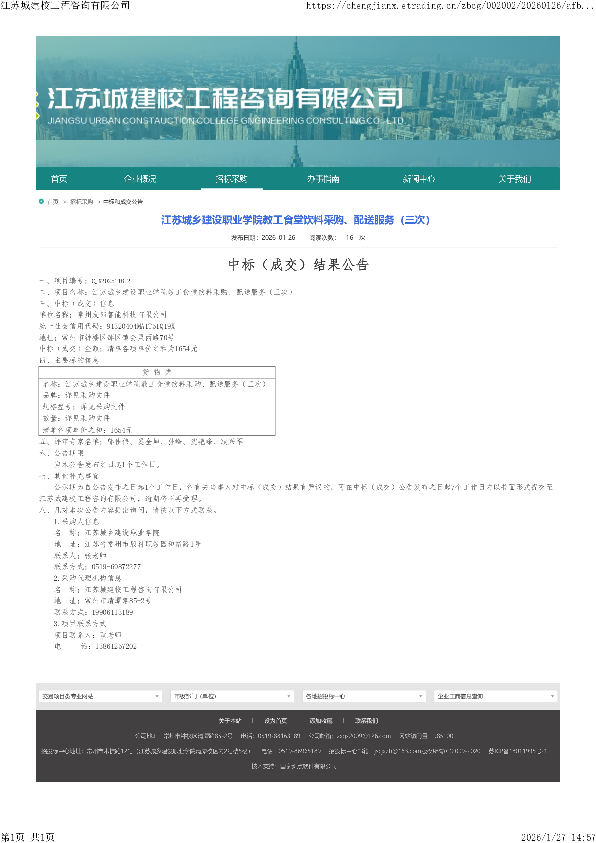 江苏城乡建设职业学院教工食堂饮料采购、配送服务(三次) 成交公告