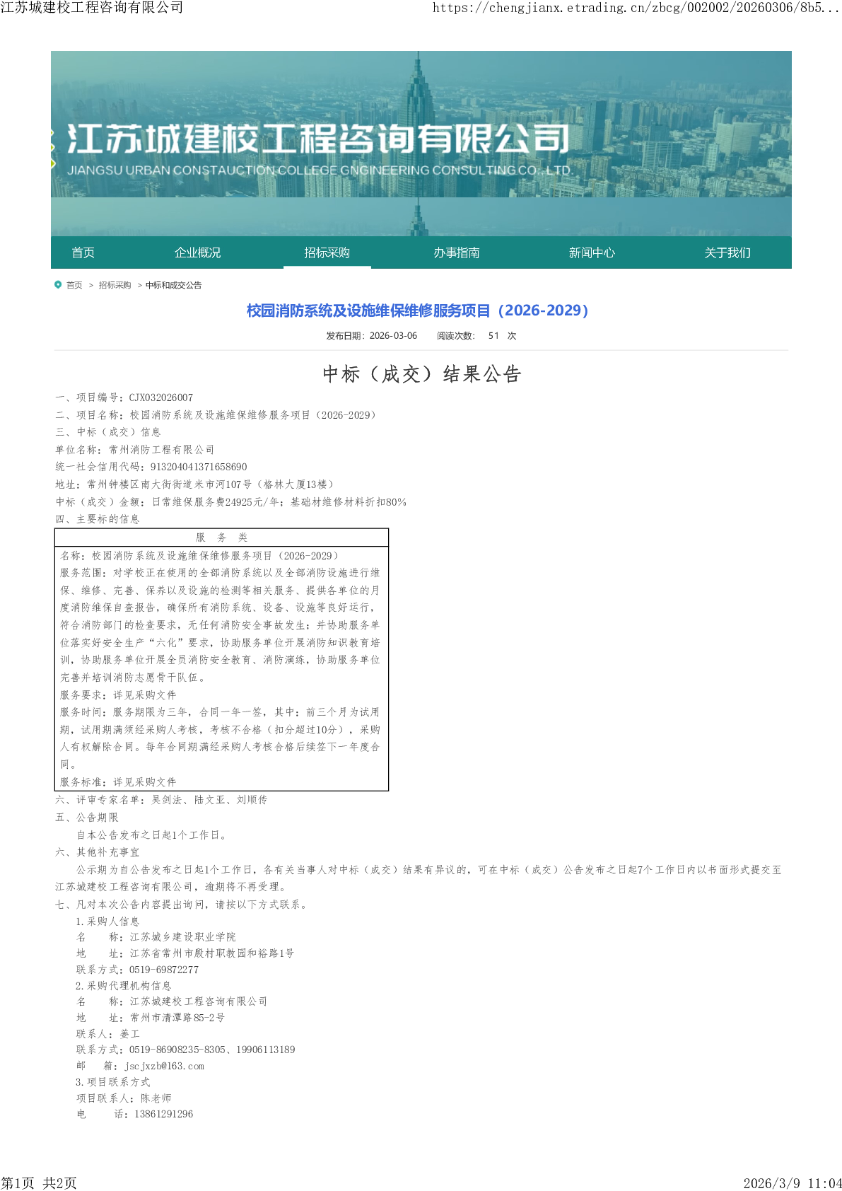 江苏城乡建设职业学院校园消防系统及设施维保维修服务项目(2026-2029)成交公告