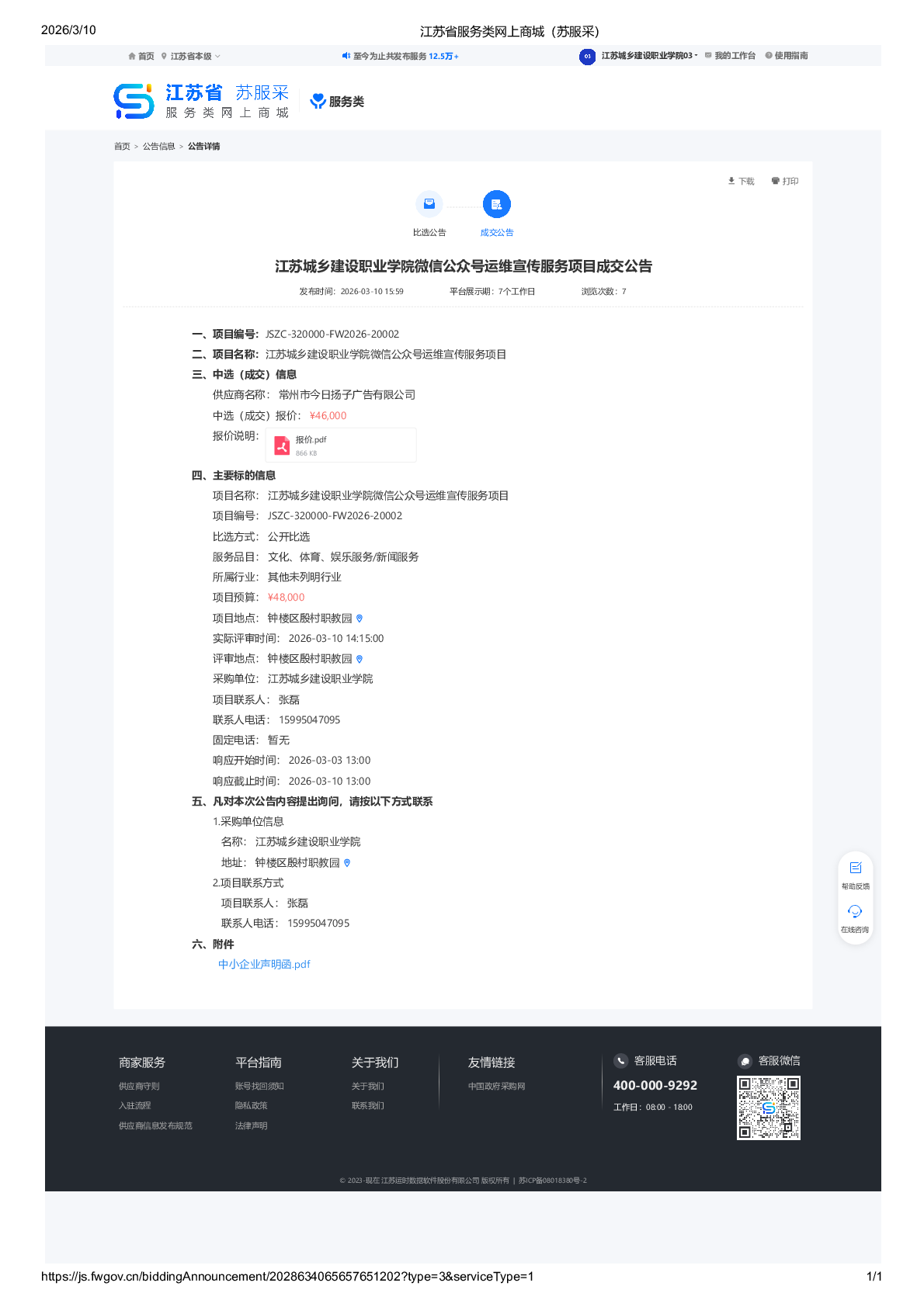 江苏城乡建设职业学院微信公众号运维宣传服务项目成交公告