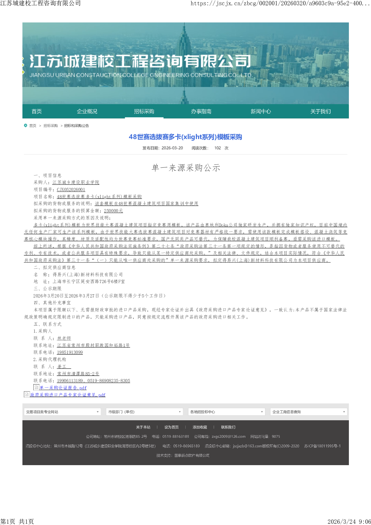江苏城乡建设职业学院48世赛选拔赛多卡(xlight系列)模板单一来源采购公示