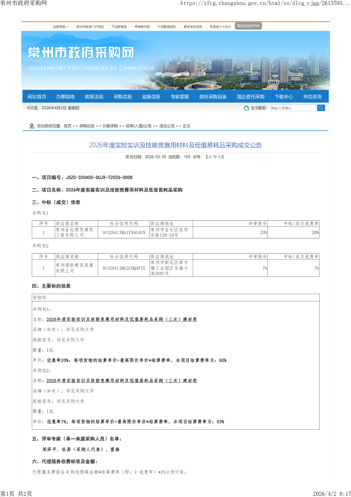 江苏城乡建设职业学院2026年度实验实训及技能竞赛用材料及低值易耗品采购成交公告