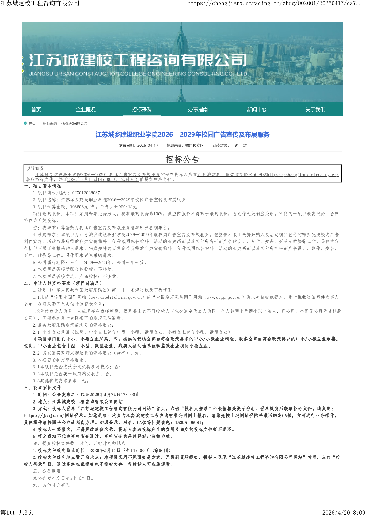 江苏城乡建设职业学院2026—2029年校园广告宣传及布展服务